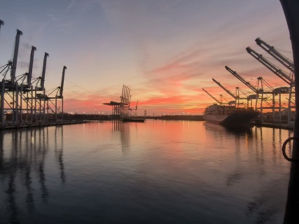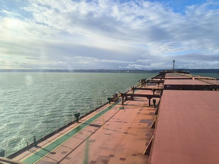 隨著船舶卸貨作業(yè)的完成,準(zhǔn)備啟航時(shí),看著身邊人們匆忙的背影,手足無措的我不知道自己該做些什么,后面聽從水頭的指引,明白了自己的定位,在確保安全的前提下主動(dòng)協(xié)助前輩完成輔助工作,對(duì)船舶靠離港流程、系離泊設(shè)備使用及團(tuán)隊(duì)配合要求有了直觀的了解。隨著離碼頭越來越遠(yuǎn),岸邊的建筑越來越小,耳邊沒有了城市的喧囂,只有海浪拍打船身的聲響,還有引擎持續(xù)不斷的轟鳴。