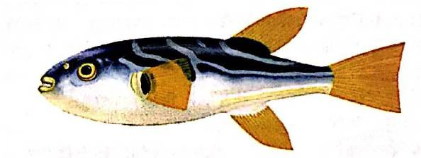 條紋東方鲀體形似暗色東方鲀,上下頷各有齒2枚,體背及腹面均被密生小刺,體上半部具有藍(lán)白兩色相間的波狀條紋,背鰭及胸鰭基部各有一藍(lán)黑色斑塊,腹面白色,上下唇、鼻囊及各鰭紹均呈艷黃色,背鰭、臀鰭幾相對(duì)。無腹鰭,尾鰭截形或稍內(nèi)凹。分布于沿海及江河口。肉鮮美,富脂肪,蛋白質(zhì)含量很高。但其肝臟、生殖腺和血液有劇毒,食用時(shí)應(yīng)特別慎重,一般應(yīng)腌制后食用較安全。