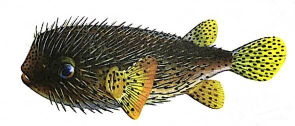 弓斑東方鲀?yōu)榻5讓尤馐承贼~類,以貝類、甲殼類和小魚為食,分布于東南沿海及其江河下游。血及內(nèi)臟劇毒,須慎食。