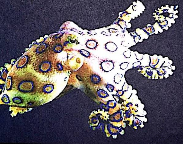 藍(lán)色圓環(huán)章魚體形較小,生活在澳大利亞以東的海域,尤其是大堡礁海域,體色淡灰白色,綴有彩虹色圓環(huán)標(biāo)記,有劇毒,受踐踏或者觸摸時(shí),可發(fā)出致命一擊。所以,對(duì)所有熱帶礁石附近的章魚都要極其小心。