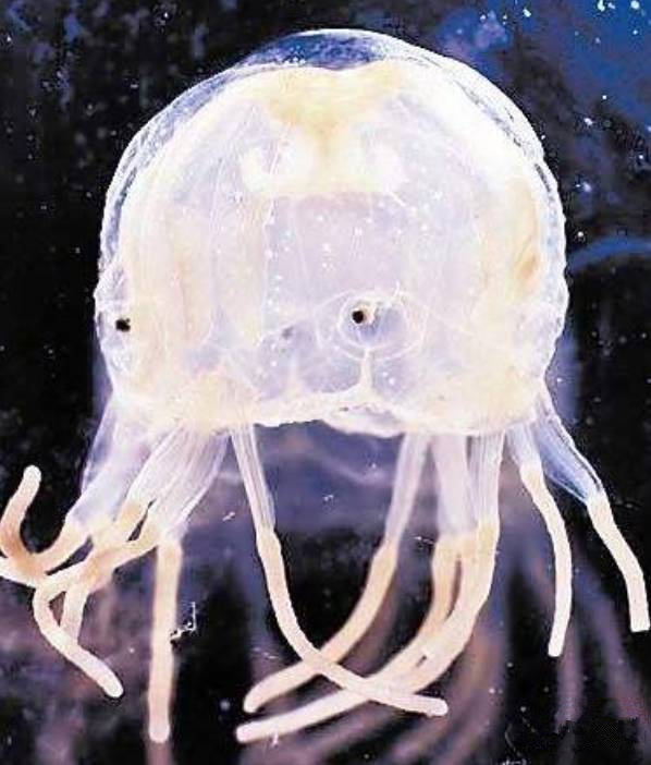 又稱海黃蜂水母,主要生活在澳大利亞東北沿海水域,經(jīng)常漂浮在昆士蘭海岸的淺海水域,被認(rèn)為是目前世界上已知的、對(duì)人類毒性最強(qiáng)的生物。人被它的觸手觸及后,在30s內(nèi)便可導(dǎo)致死亡。成年的箱水母有足球那么大,呈蘑菇形狀,近乎透明。
