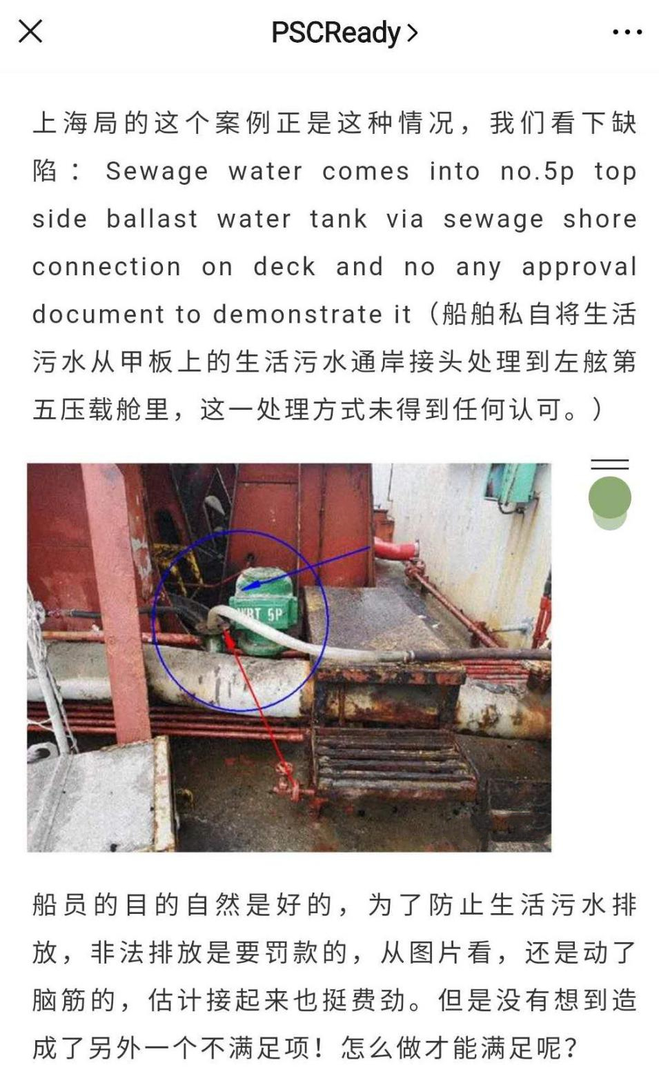 再有大家比較關(guān)心的就是在無(wú)法排放的區(qū)域儲(chǔ)存的問(wèn)題。目前大部分船上由于配備符合《MEPC.159(55)》標(biāo)準(zhǔn)的生活污水處理裝置,所以沒(méi)有專門(mén)的生活污水儲(chǔ)存柜(HOLDING TANK)或者配備的HOLDING TANK設(shè)計(jì)上是用來(lái)儲(chǔ)存船上船員生活產(chǎn)生的“黑水”的,普遍偏小。當(dāng)遇到某些地方法規(guī)要求生活污水均不得排放入海的時(shí)候,無(wú)法確定“灰水”如何處理,導(dǎo)致連“灰水”一起不敢排放——而“灰水”每天的產(chǎn)量是比較大的,HOLDING TANK根本存不下。這就需要船上靠港前咨詢代理,最好拿到當(dāng)?shù)赜嘘P(guān)規(guī)定的復(fù)印件或傳真,這樣好按照當(dāng)?shù)匾?guī)定執(zhí)行。在連“灰水”都不許排放的地方,大家常見(jiàn)的做法是利用一個(gè)空艙作為臨時(shí)儲(chǔ)存艙,加裝臨時(shí)管路通過(guò)國(guó)際通岸接頭排入——這種做法嚴(yán)格來(lái)說(shuō)也是違規(guī)的,因?yàn)闆](méi)有船級(jí)社認(rèn)證。我在網(wǎng)上看到一種做法就是船上改裝一個(gè)艙并加裝永久管路,然后由船級(jí)社進(jìn)行簽注認(rèn)證;我認(rèn)為這是一個(gè)比較可行且合理的辦法。當(dāng)然也需要根據(jù)實(shí)際情況討論,各輪狀況不一樣,要具體情況具體分析。